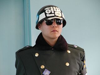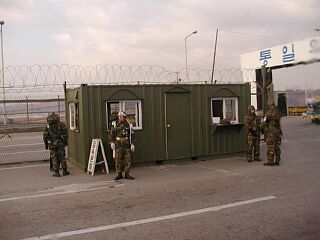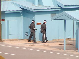 警備中の国連軍兵士。半身を隠した状態で動かずに警備している。