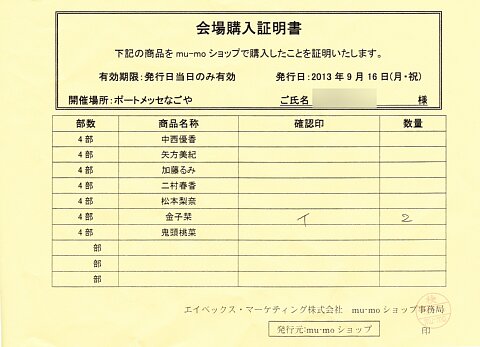 金子栞は3部を持っていたのだが、閑散としていたので最近始まった当日券を買ってみた。長蛇の列なのはしかたがないとして、その部の時間にその部の当日券しか売らない。今日のように人が少なければいいものの、普段はあらかじめ握手券を持っている部の買い増しは難しいのではないか。あと、転売防止とはいえこれまでいちいち身分確認をして紙書かせるのでめんどくさい。