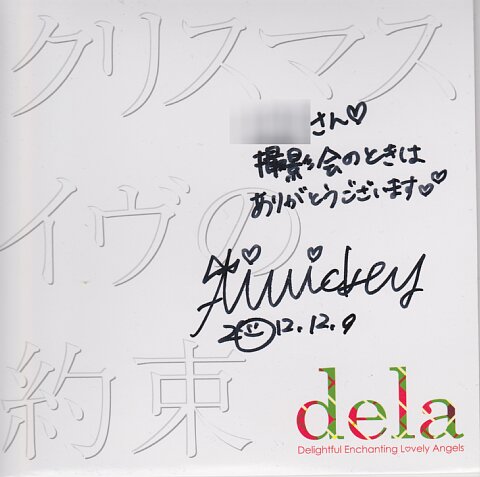 delaのクリスマスライブ。X-HALLはOS☆Uあたりがよく使っているハコだが、広さは池袋のルイードK3くらいだろうか。構成は良かったと思うが、MCというか途中の寸劇が内輪の危ないネタ(元OS☆Uのふたりに対して「あいつらもやらかさなければ今頃はダイヤモンドホールでやってたのにな」とか)で初見にはわからないだろうというのと、アンコール一曲目に叙情系の曲を持って来たのは失敗(騒ぎたい客がいる)くらいか。終了後に物販とサイン/握手/写メ会。500円で写真買えばサインと握手と写真(カメラでもケータイでもかまわない)なので、1000円で握手、2000円でサインか写真のプラチナムよりは良心的と言える。